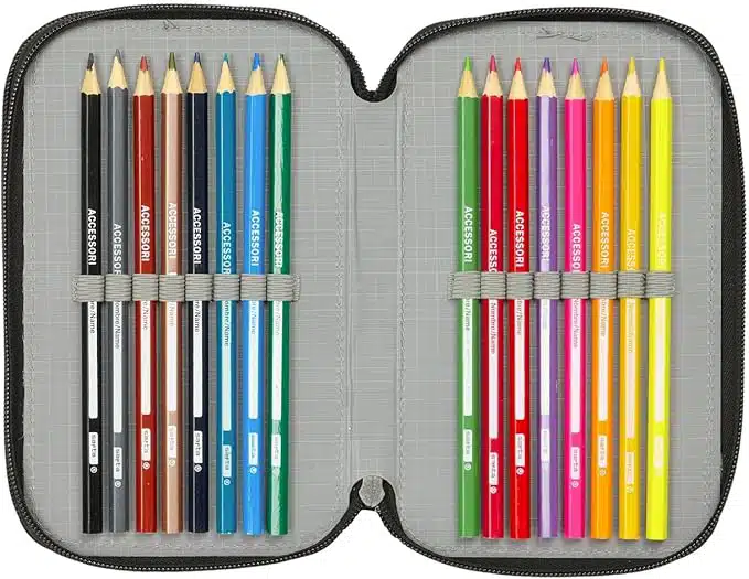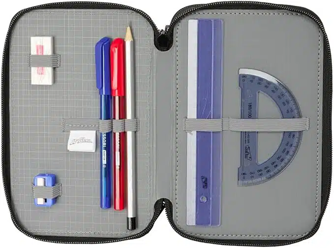 - SPACIOUS AND LIGHTWEIGHT: Contains 37 pieces: rubber, graphite pencil, blue-red ballpoint pen, sharpener, blue ruler, engraving and semicircle (1 compartment). 16 wood colours (2nd compartment). 14 coloured felt tip pens (3rd compartment). Handles on the sliders for easy opening. Dimensions: Width: 125 mm. Length:55mm Height: 195mm Capacity: 1.3 L. Weight: 0.44 kg
