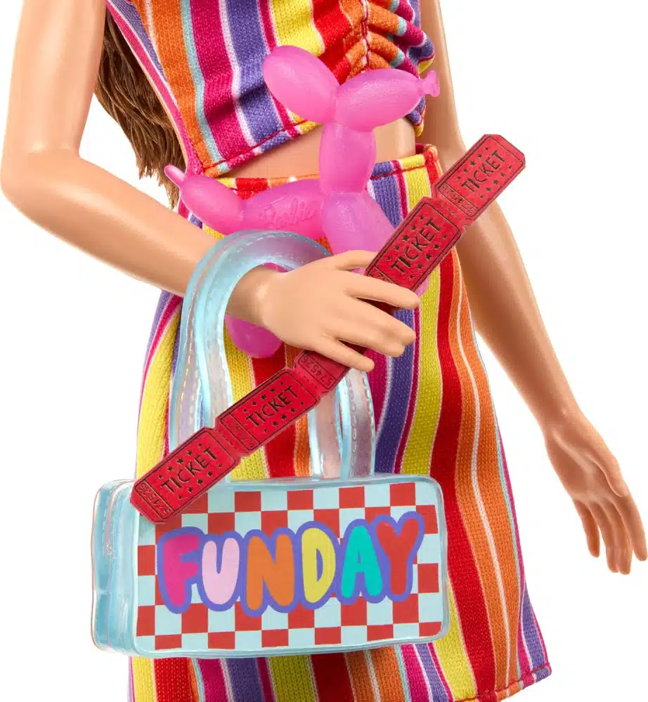 She’s so fashionably festive in her colorful top, skirt, and sneakers perfect for wandering the fair. Starry sunglasses and a checkered purse finish her dreamy bright look. With accessories like a balloon dog, tickets, and popcorn, kids can play out so many adventures at the fair with Barbie!